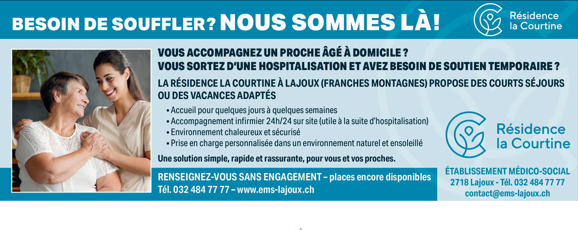 RÉSIDENCE LA COURTINE À la Résidence La Courtine, nous accueillons chaque personne avec attention, respect et simplicité. Située au cœur des Franches-Montagnes, notre résidence offre un environnement calme, lumineux et rassurant, où nous veillons à ce que chacun se sente chez soi, en sécurité. Nous avons fait le choix d’une structure à taille humaine : moins de résidents, mais davantage de présence, d’écoute et de disponibilité.